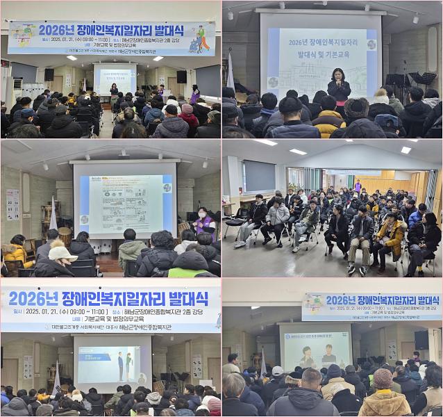 ÇØ³²±ºÀå¾ÖÀÎÁ¾ÇÕº¹Áö°üÀº 2026³â Àå¾ÖÀκ¹ÁöÀÏÀÚ¸® ¹ß´ë½Ä ¹× Çʼö±³À°À» ÁøÇàÇÏ¿´½À´Ï´Ù. À̹ø ¹ß´ë½Ä¿¡´Â Àå¾ÖÀκ¹ÁöÀÏÀÚ¸® Âü¿©ÀÚµéÀÌ Âü¼®ÇÏ¿© »ç¾÷ ¿î¿µ ¹æÇ⠾ȳ»¿Í ÇÔ²² ¼ºÈñ·Õ ¿¹¹æ±³À°, Àå¾ÖÀÎ½Ä °³¼±±³À°, »ê¾÷¾ÈÀü±³À° µî ±Ù¹«¿¡ ¾Õ¼ ÇÊ¿äÇÑ ¹ýÁ¤Àǹ«±³À°À» À̼öÇÏ¿´½À´Ï´Ù. ¾ÕÀ¸·Îµµ Âü¿©ÀÚµéÀÌ ¾ÈÀüÇÏ°í ¾ÈÁ¤ÀûÀ¸·Î ÀÏÀÚ¸®¿¡ Âü¿©ÇÒ ¼ö ÀÖµµ·Ï ÇÊ¿äÇÑ Áö¿øÀ» À̾ ¿¹Á¤ÀÔ´Ï´Ù.